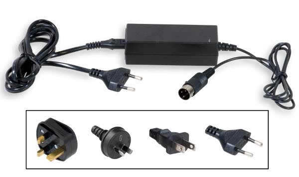 Alimentador de 100-240V/12VCC. El tablero puede ser alimentado también con una batería recargable externa (véase Opciones).